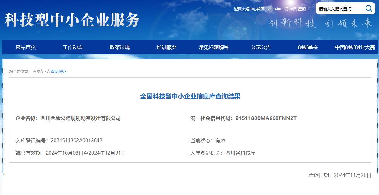 近日,四川省科學(xué)技術(shù)廳公布了本年度第五批入庫科技型中小企業(yè)名單,雅安交建集團(tuán)四川西康公路規(guī)劃勘察設(shè)計有限公司榮獲“國家級科技型中小企業(yè)”稱號,標(biāo)志著公司在科技創(chuàng)新道路上邁向了新的高度。