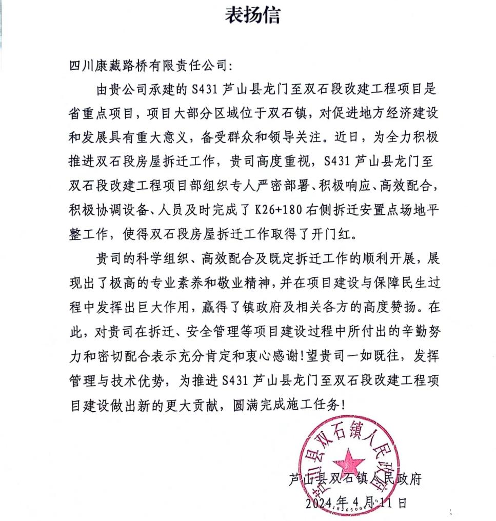 近日,雅安交建集團(tuán)四川康藏路橋有限責(zé)任公司收到來(lái)自蘆山縣雙石鎮(zhèn)人民政府的表?yè)P(yáng)信。信中對(duì)S431蘆山縣龍門(mén)至雙石段改建工程項(xiàng)目部積極協(xié)調(diào)設(shè)備、人員配合當(dāng)?shù)卣瓿蒏26+180右側(cè)拆遷安置點(diǎn)場(chǎng)地平整工作,使得雙石段房屋拆遷工作取得了開(kāi)門(mén)紅給予了高度評(píng)價(jià)和贊揚(yáng)。