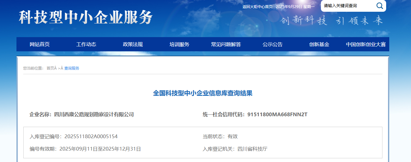 四川西康公路規(guī)劃勘察設(shè)計(jì)有限公司再獲“科技型中小企業(yè)”認(rèn)定