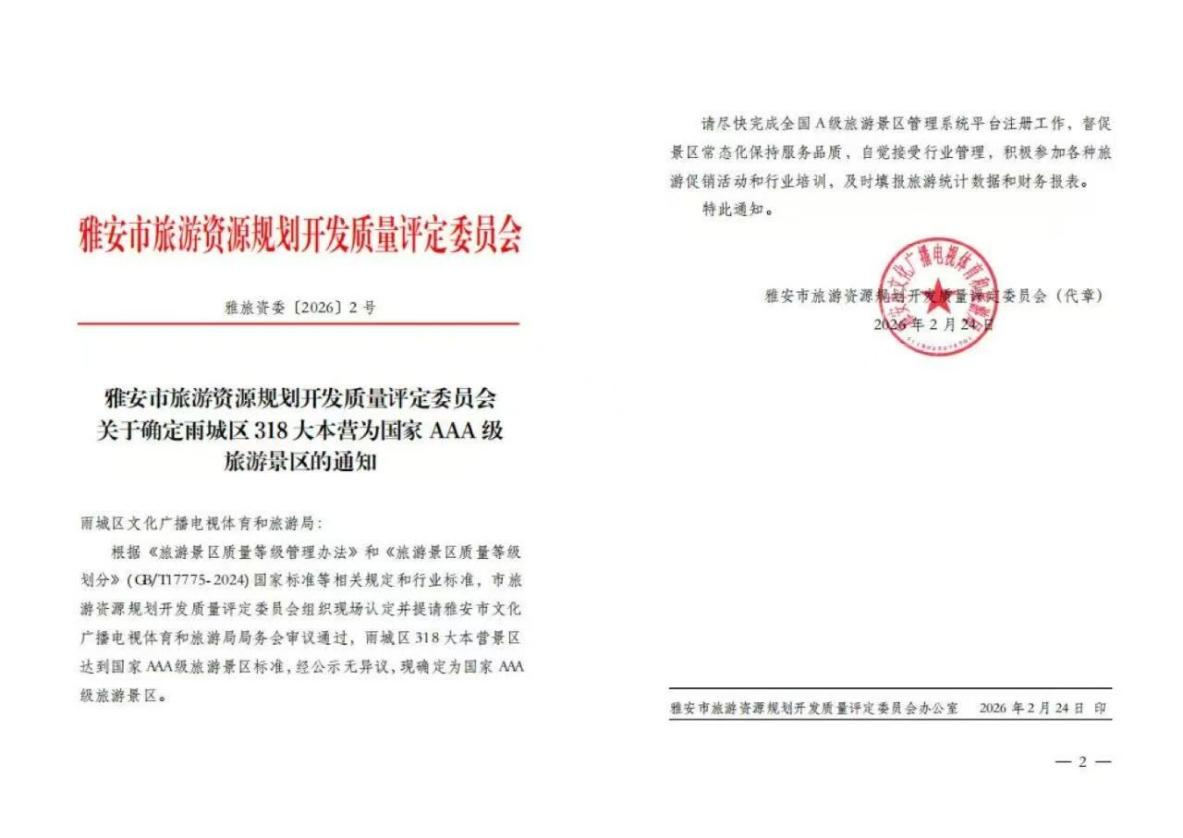 2月24日,經(jīng)雅安市文化廣播電視體育和旅游局局務(wù)會(huì)審議通過(guò),中國(guó)·雅安318自駕大本營(yíng)正式被確定為國(guó)家AAA級(jí)旅游景區(qū)。