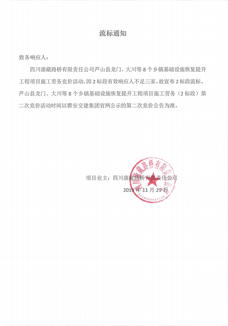 四川康藏路橋有限責(zé)任公司蘆山縣龍門、大川等8個(gè)鄉(xiāng)鎮(zhèn)基礎(chǔ)設(shè)施恢復(fù)提升工程項(xiàng)目施工勞務(wù)(2標(biāo)段)競價(jià)流標(biāo)通知