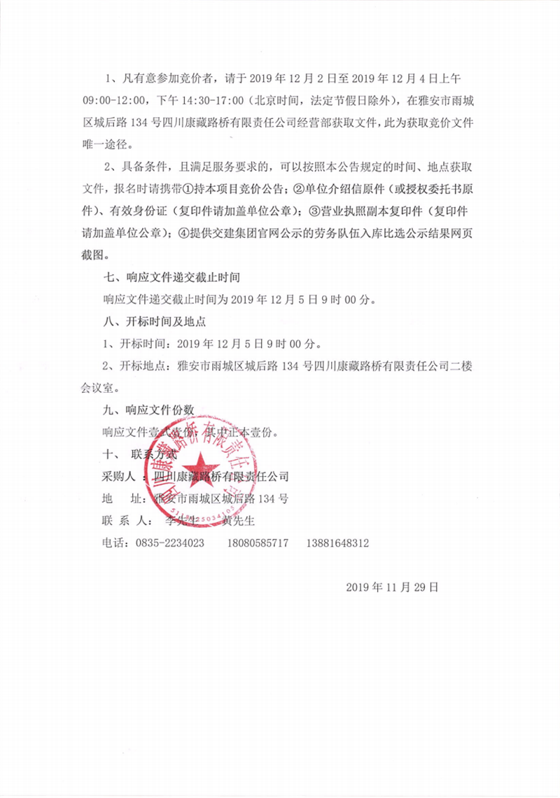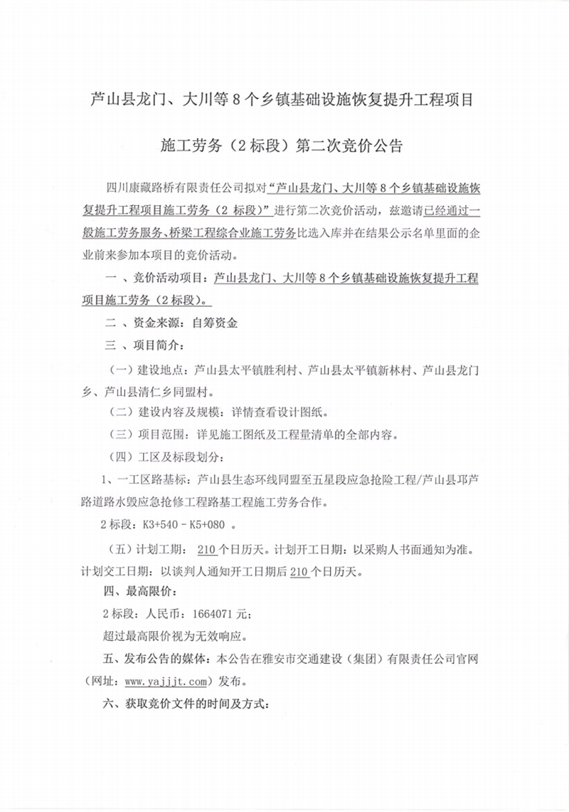 四川康藏路橋有限責(zé)任公司蘆山縣龍門、大川等8個(gè)鄉(xiāng)鎮(zhèn)基礎(chǔ)設(shè)施恢復(fù)提升工程項(xiàng)目施工勞務(wù)(2標(biāo)段)第二次競價(jià)公告