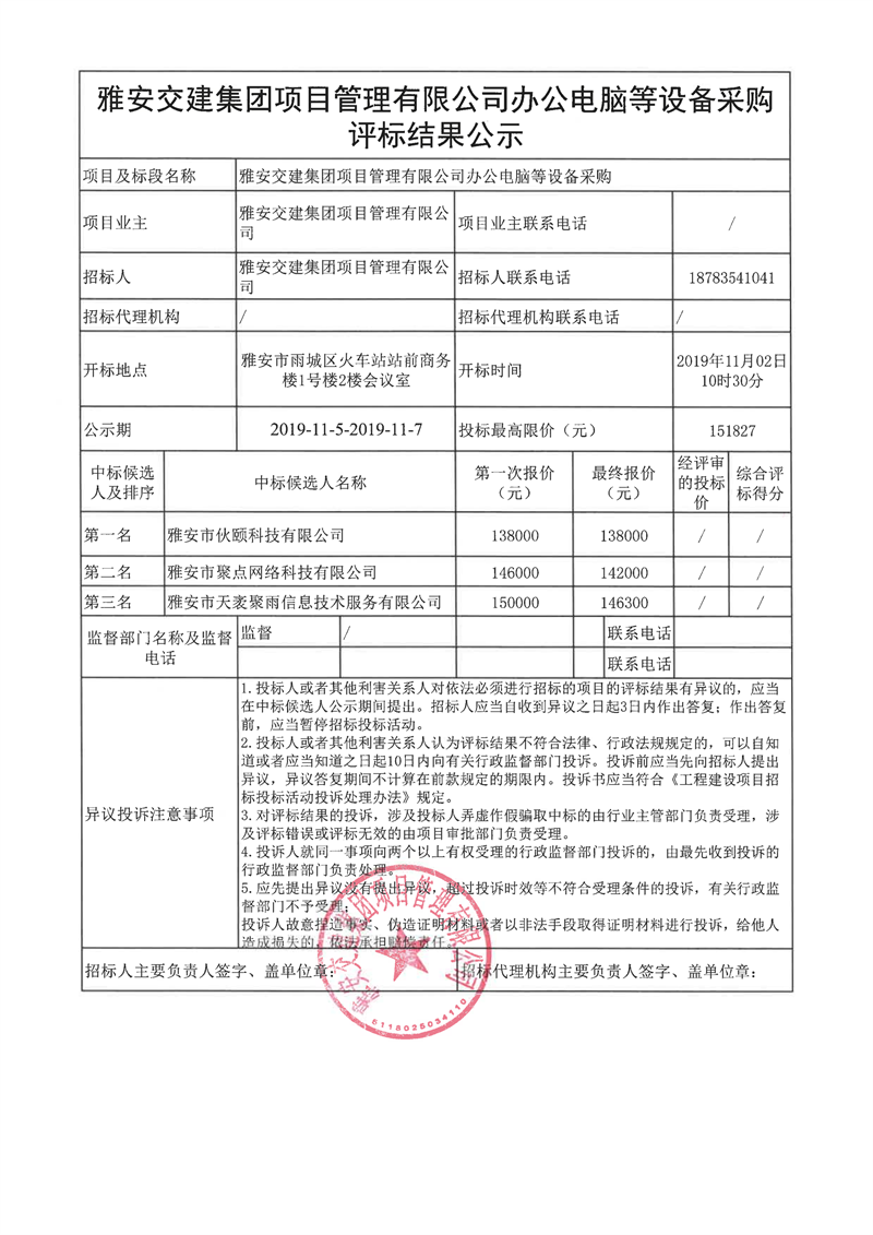 雅安交建集團(tuán)項(xiàng)目管理有限公司辦公電腦等設(shè)備采購評(píng)標(biāo)結(jié)果公示