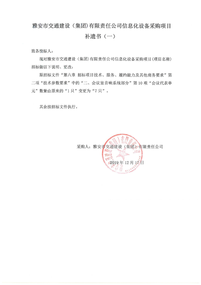 雅安市交通建設(集團)有限責任公司信息化設備采購項目補遺書(一)