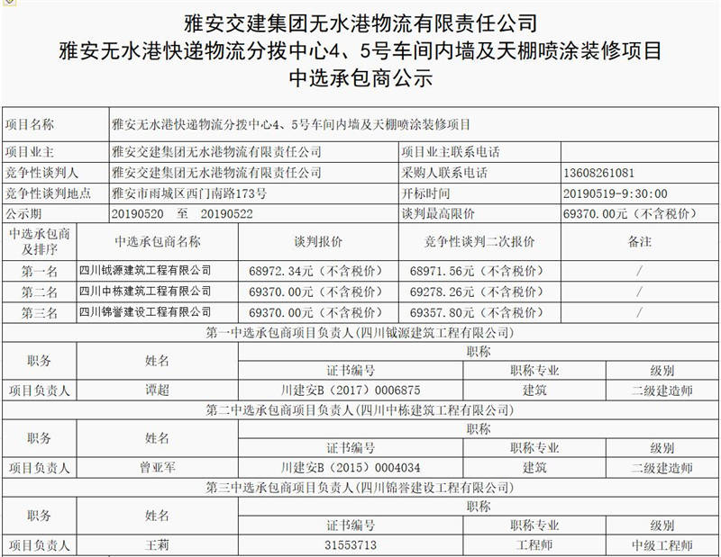 雅安無(wú)水港快遞物流分撥中心4、5號(hào)車(chē)間內(nèi)墻及天棚噴涂裝修項(xiàng)目中選承包商公示