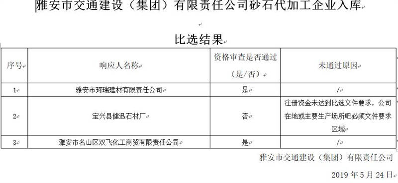 雅安市交通建設(shè)(集團)有限責任公司砂石代加工企業(yè)入庫比選結(jié)果公示