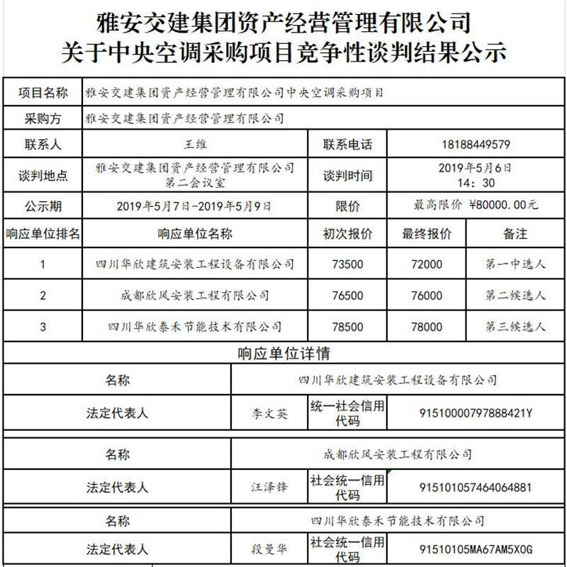 雅安交建集團資產(chǎn)經(jīng)營管理有限公司 關(guān)于中央空調(diào)采購項目競爭性談判結(jié)果公示