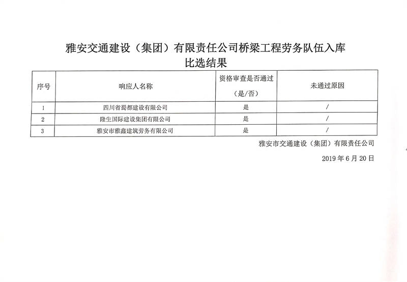 雅安交通建設(shè)(集團)有限責(zé)任公司橋梁工程勞務(wù)隊伍入庫比選結(jié)果