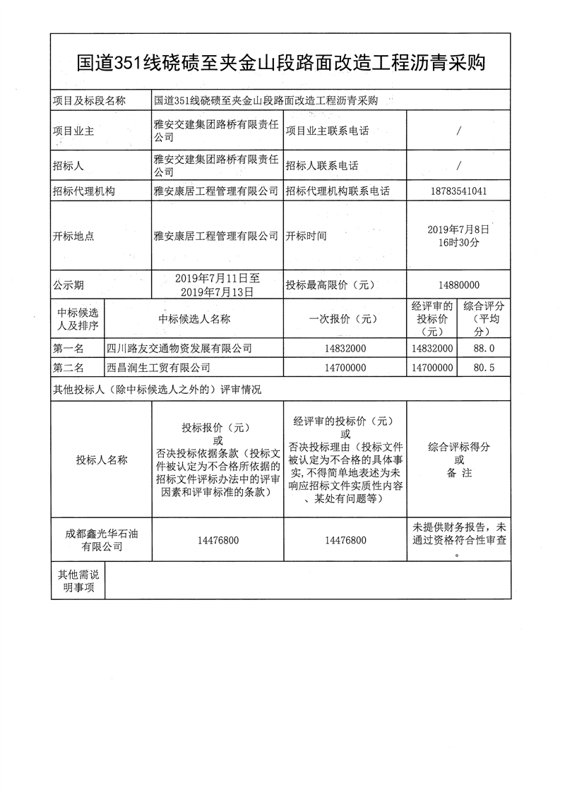 雅安交建集團路橋有限責任公司國道351線磽磧至夾金山段路面改造工程瀝青采購公開招標結果公示