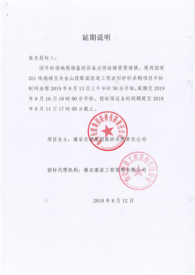 雅安交建集團路橋有限責任公司國道351線磽磧至夾金山段路面改造工程波形護欄采購延期說明