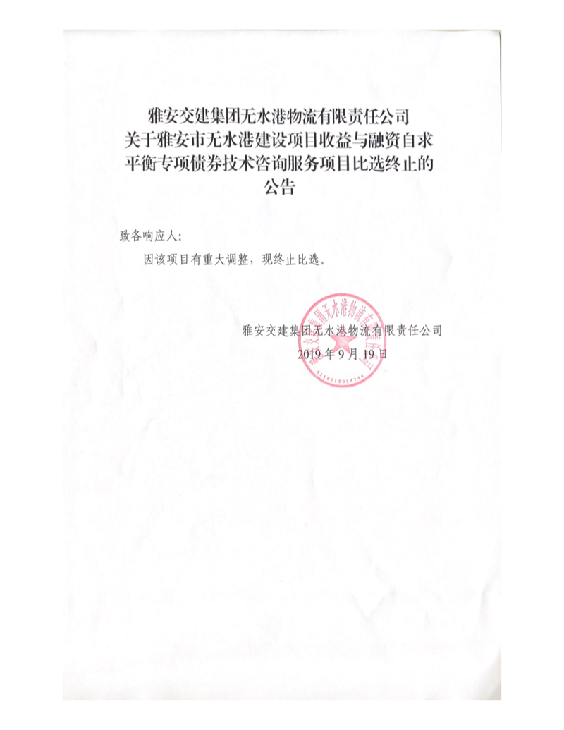 雅安交建集團(tuán)無水港物流有限責(zé)任公司關(guān)于雅安市無水港建設(shè)項(xiàng)目收益與融資自求平衡專項(xiàng)債券技術(shù)咨詢服務(wù)項(xiàng)目比選終止的公告