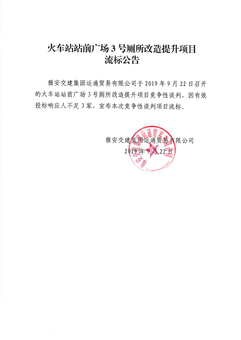 雅安交建集團運通貿(mào)易有限公司火車站站前廣場3號廁所改造提升項目流標公告