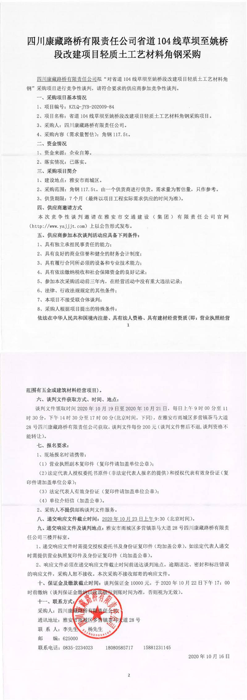 四川康藏路橋有限責(zé)任公司省道104線草壩至姚橋段改建項(xiàng)目輕質(zhì)土工藝材料角鋼采購競(jìng)爭(zhēng)性談判公告