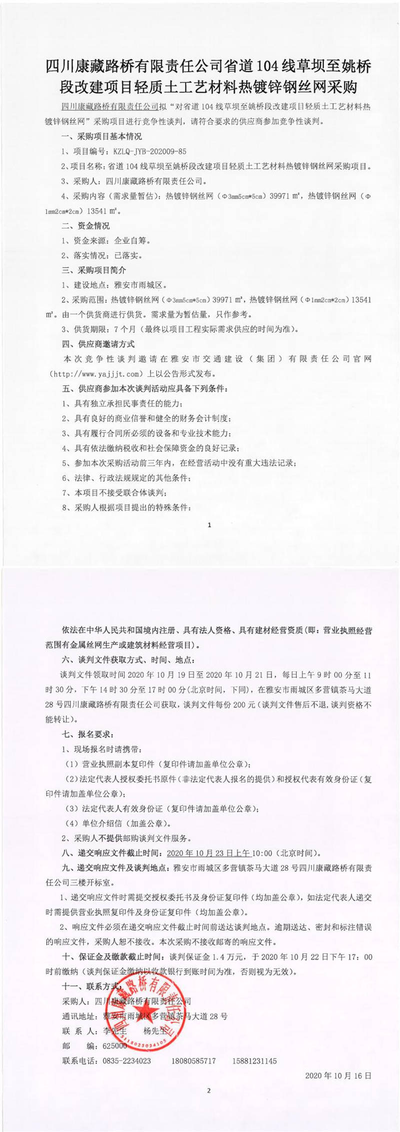 四川康藏路橋有限責(zé)任公司省道104線草壩至姚橋段改建項(xiàng)目輕質(zhì)土工藝材料熱鍍鋅鋼絲網(wǎng)采購競爭性談判公告