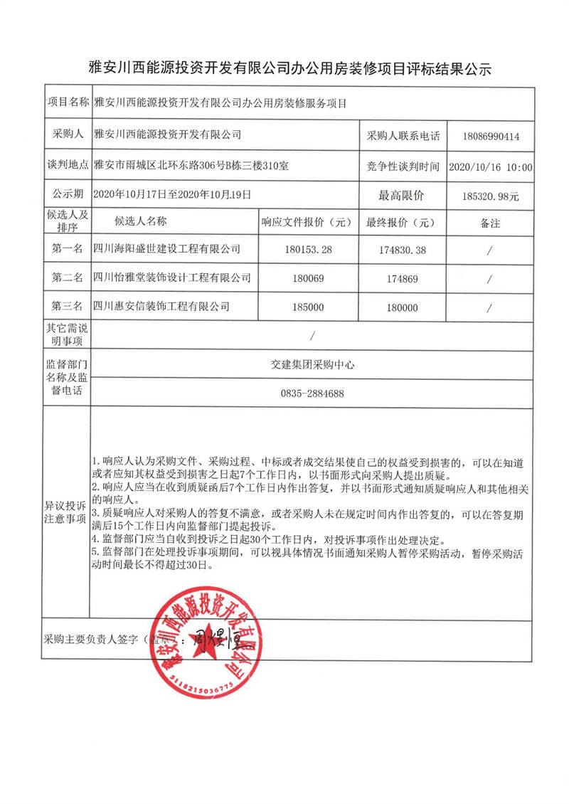 雅安川西能源投資開(kāi)發(fā)有限公司辦公用房裝修項(xiàng)目評(píng)標(biāo)結(jié)果公示