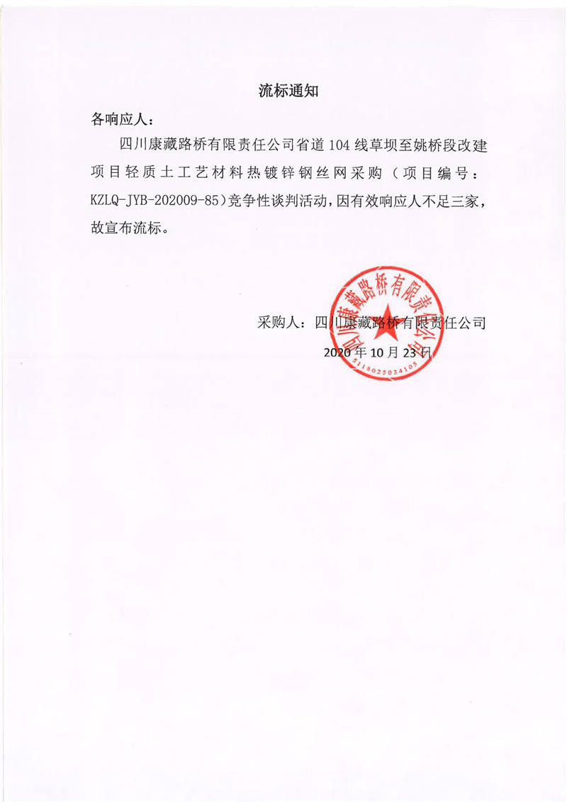 四川康藏路橋有限責(zé)任公司省道104線(xiàn)草壩至姚橋段改建項(xiàng)目輕質(zhì)土工藝材料熱鍍鋅鋼絲網(wǎng)采購(gòu)項(xiàng)目流標(biāo)通知