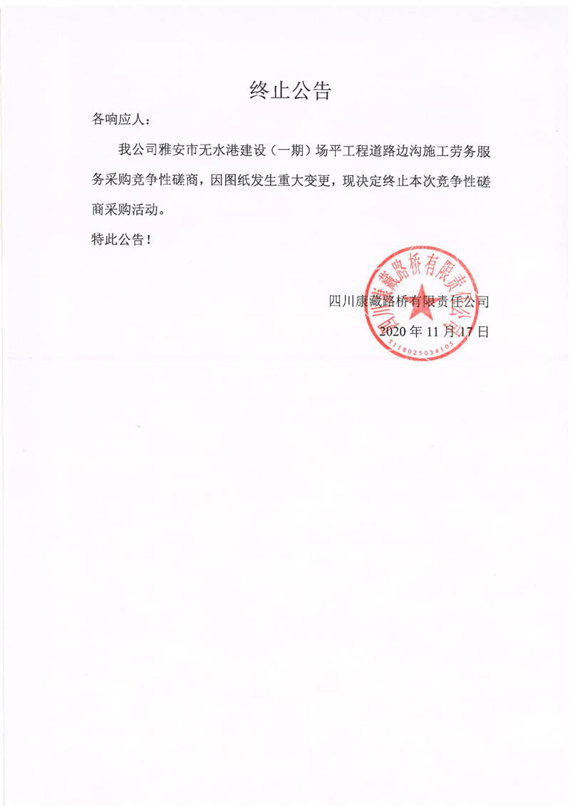 四川康藏路橋有限責(zé)任公司雅安市無水港建設(shè)(一期)場平工程道路邊溝施工勞務(wù)服務(wù)采購終止公告