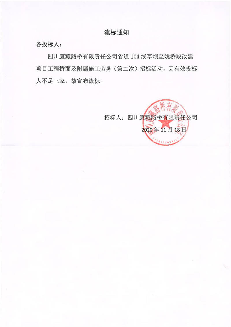四川康藏路橋有限責任公司省道104線草壩至姚橋段改建項目工程橋面及附屬施工勞務(第二次)流標通知