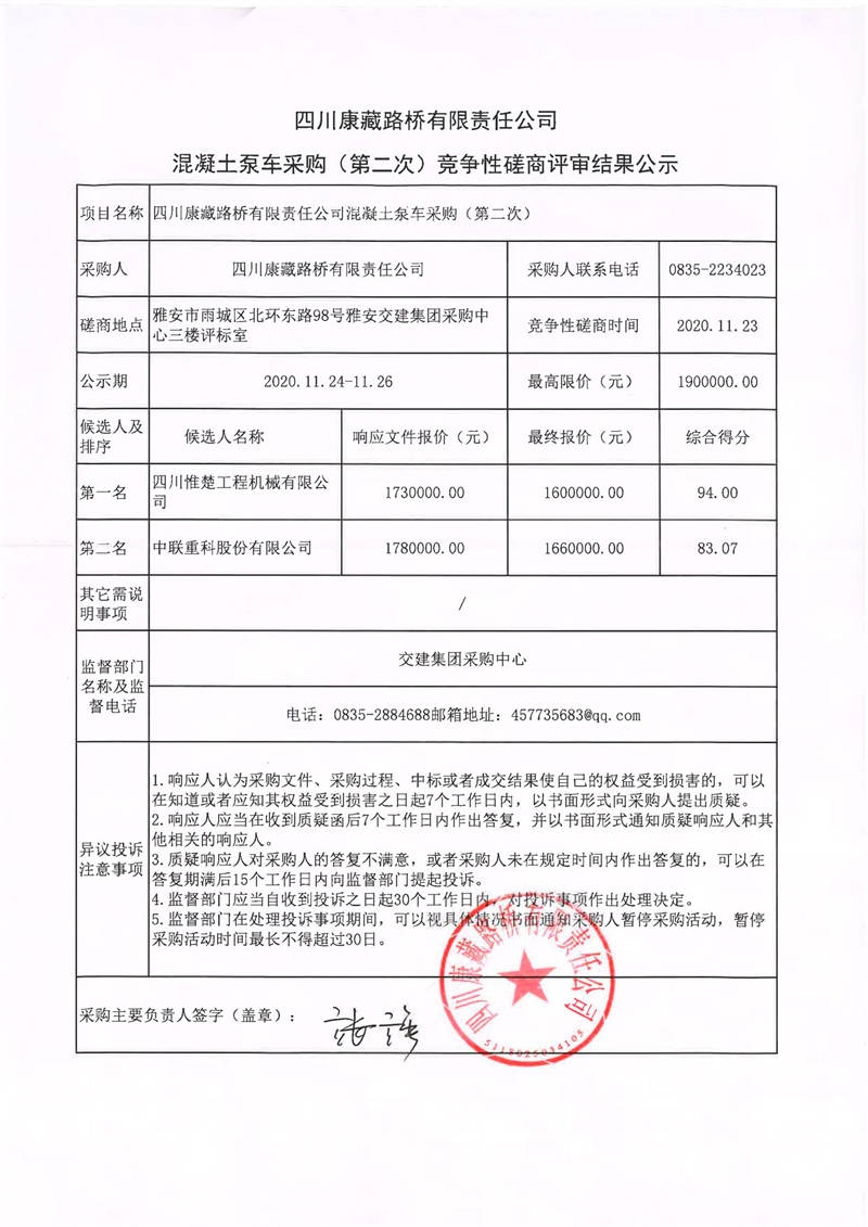 四川康藏路橋有限責(zé)任公司混凝土泵車采購(第二次)競爭性磋商評(píng)審結(jié)果公示