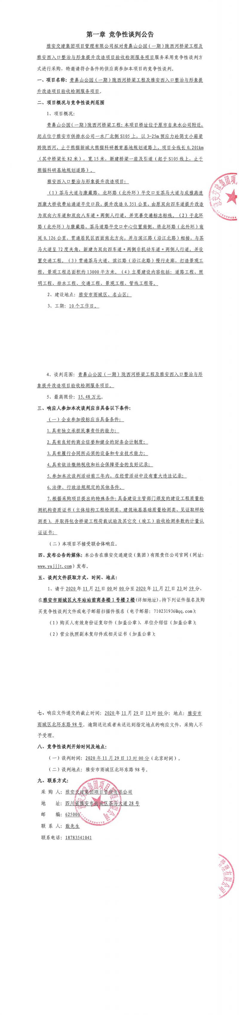 雅安交建集團(tuán)項(xiàng)目管理有限公司青鼻山公園(一期)隴西河橋梁工程及雅安西入口整治與形象提升改造項(xiàng)目驗(yàn)收檢測(cè)服務(wù)項(xiàng)目競(jìng)爭(zhēng)性談判公告