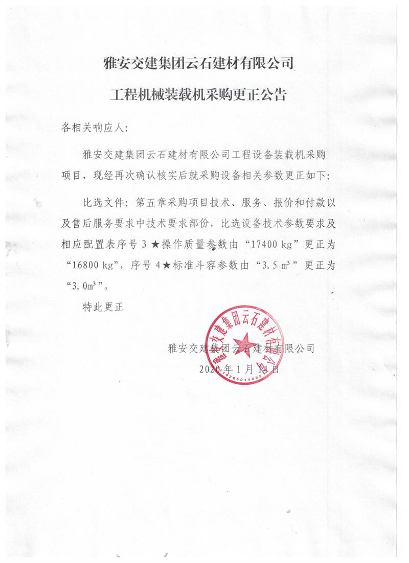 雅安交建集團(tuán)云石建材有限公司工程機(jī)械裝載機(jī)采購(gòu)更正公告