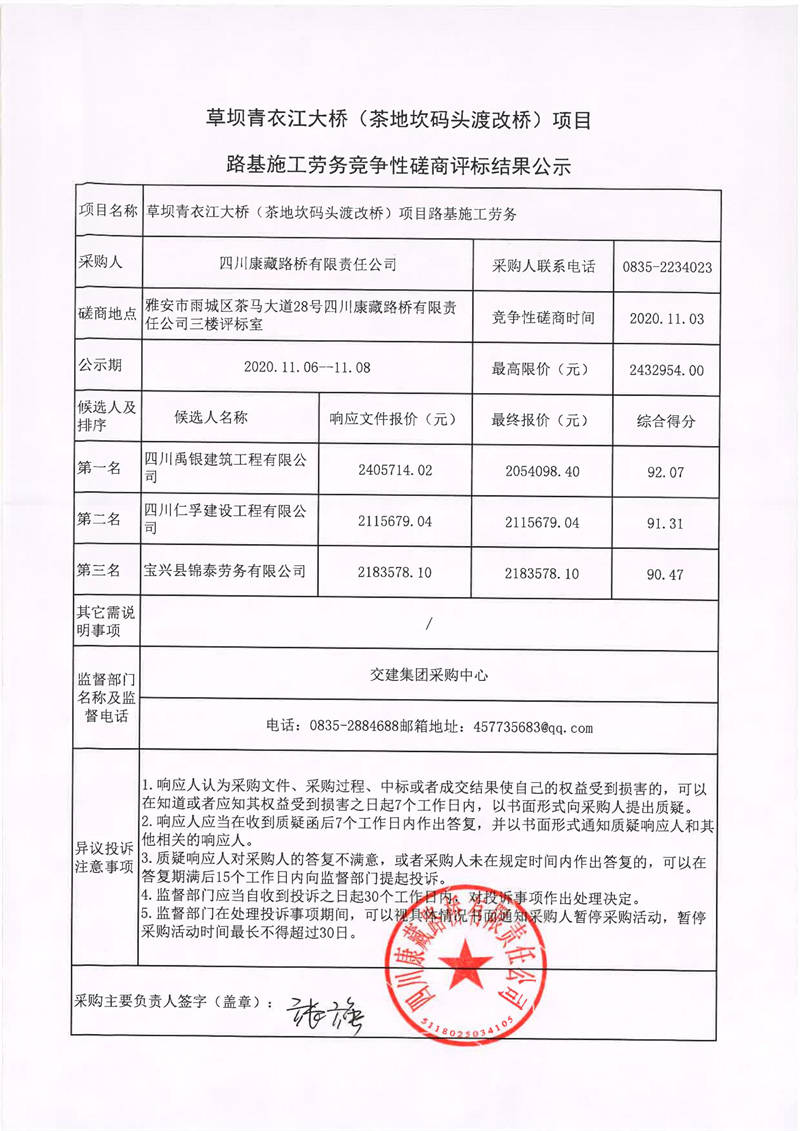 四川康藏路橋有限責任公司草壩青衣江大橋(茶地坎碼頭渡改橋)項目路基施工勞務競爭性磋商評標結(jié)果公示