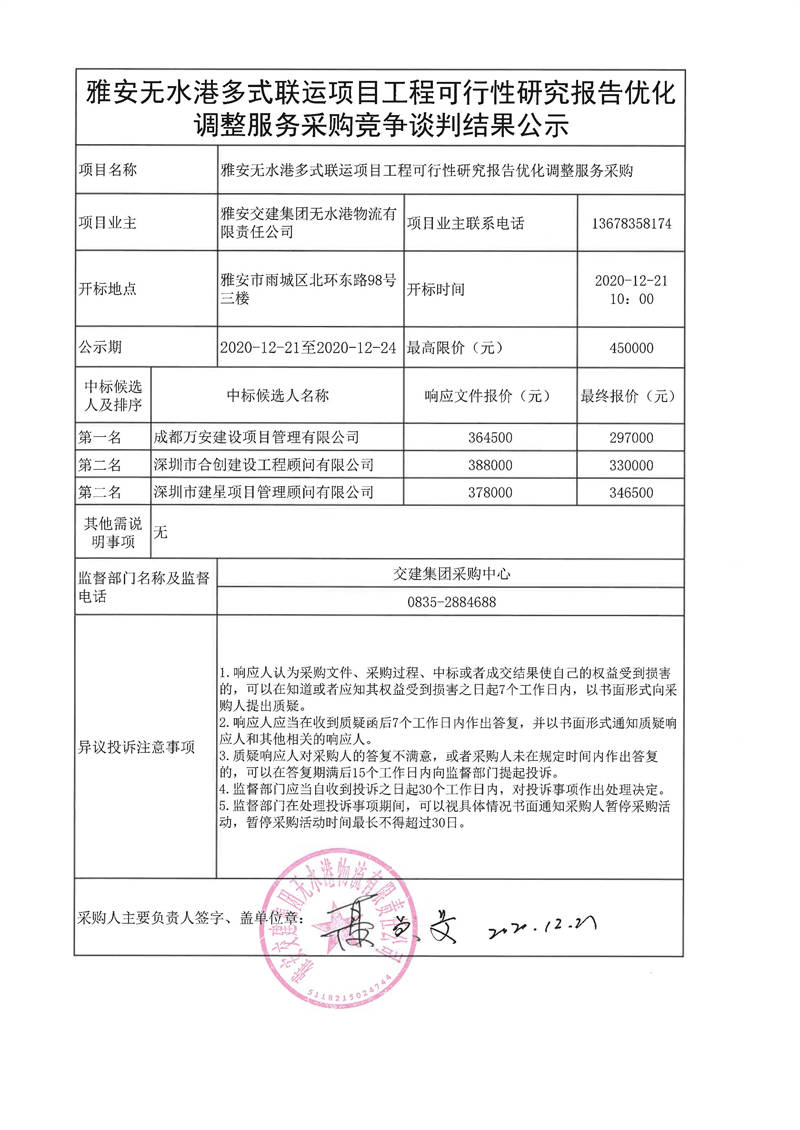 雅安交建集團(tuán)無水港物流有限責(zé)任公司雅安無水港多式聯(lián)運(yùn)項(xiàng)目工程可行性研究報(bào)告優(yōu)化調(diào)整服務(wù)采購競爭談判結(jié)果公示