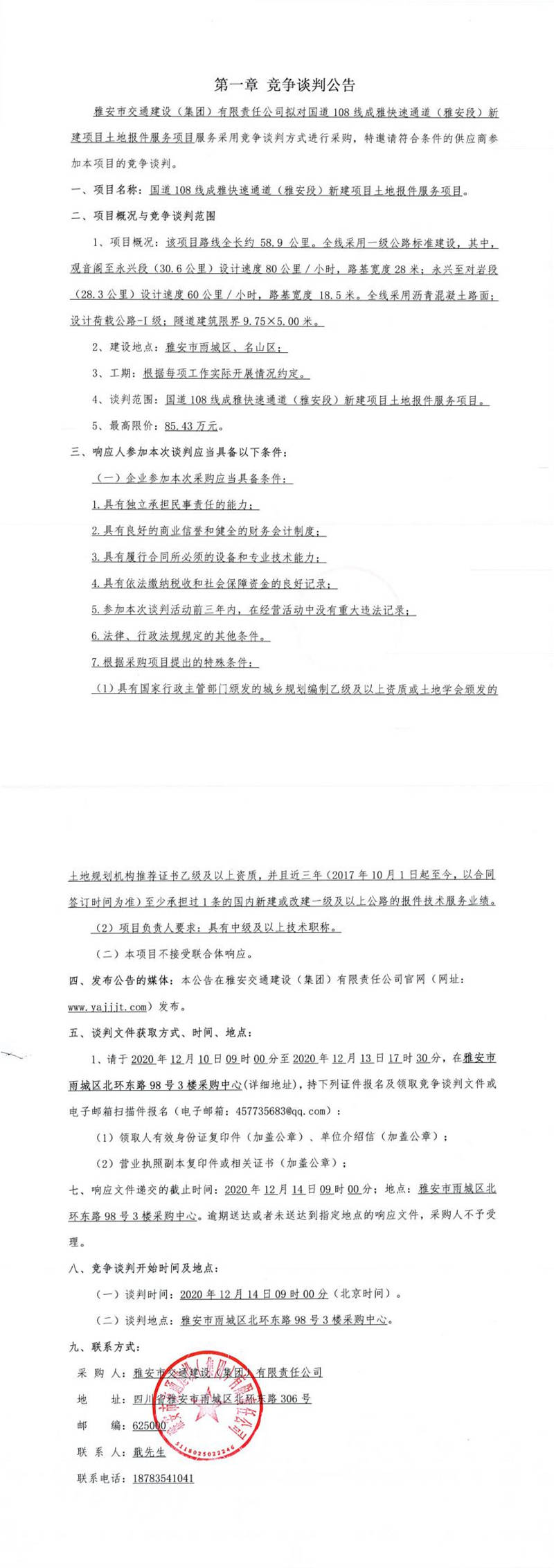 雅安市交通建設(shè)(集團(tuán))有限責(zé)任公司國道108線成雅快速通道(雅安段)新建項(xiàng)目土地報(bào)件服務(wù)項(xiàng)目競爭談判公告