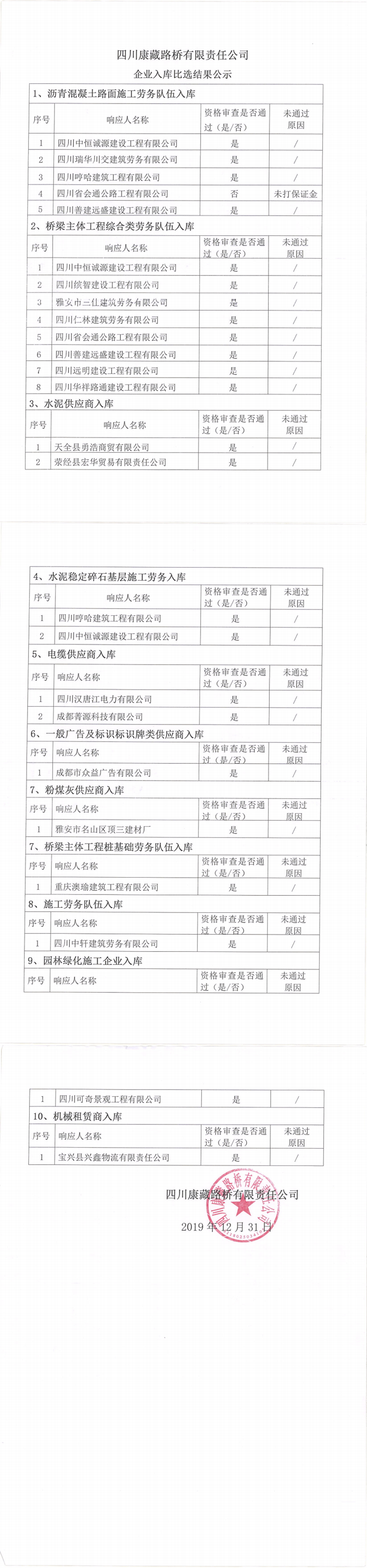 四川康藏路橋有限責(zé)任公司企業(yè)入庫(kù)比選結(jié)果公示