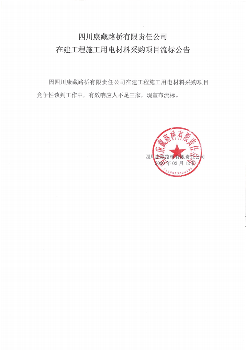 四川康藏路橋有限責(zé)任公司在建工程施工用電材料采購項(xiàng)目流標(biāo)公告