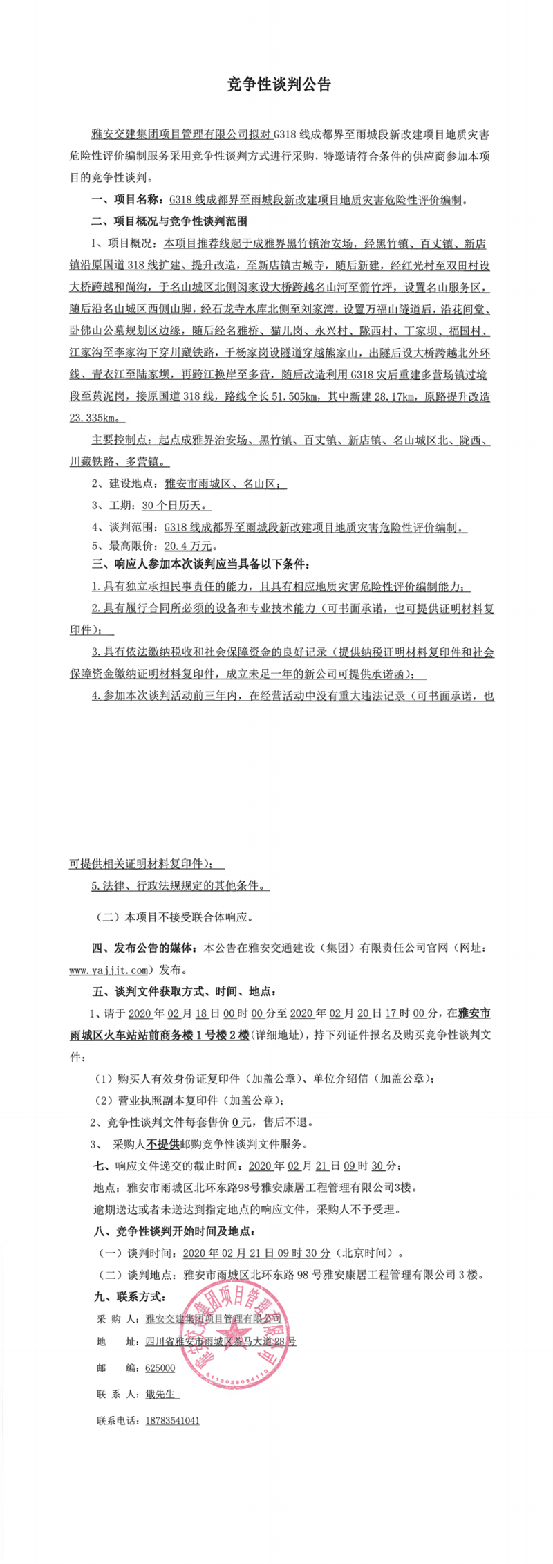 雅安交建集團項目管理有限公司G318線成都界至雨城段新改建項目地質(zhì)災(zāi)害危險性評價編制競爭性談判公告