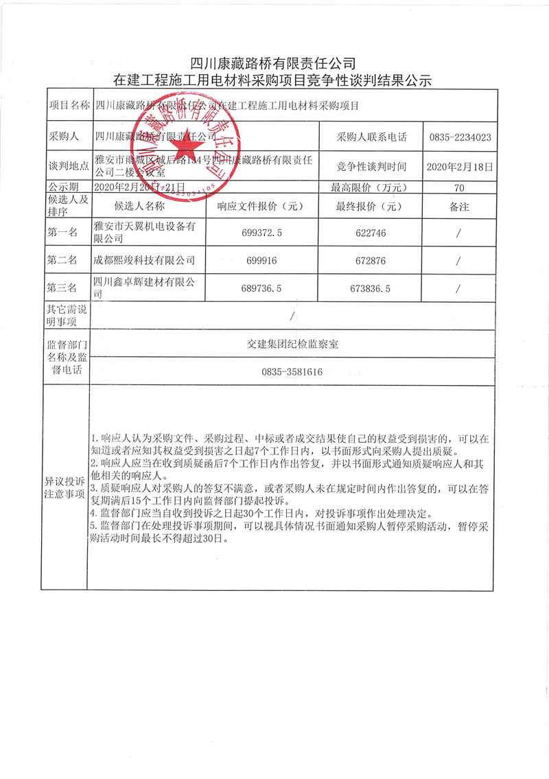 四川康藏路橋有限責(zé)任公司在建工程施工用電材料采購項(xiàng)目競(jìng)爭性談判結(jié)果公示