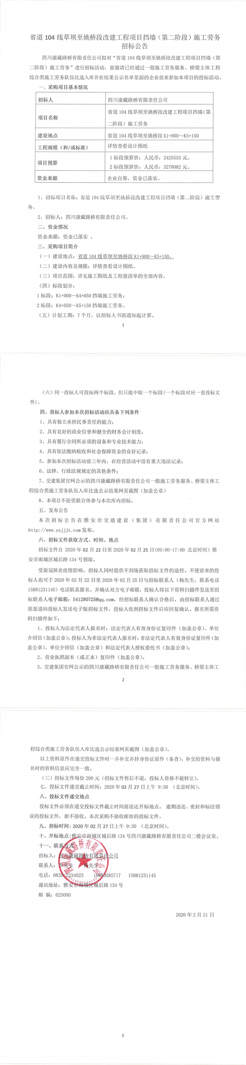 四川康藏路橋有限責(zé)任公司省道104線草壩至姚橋段改建工程項目擋墻(第二階段)施工勞務(wù)招標公告
