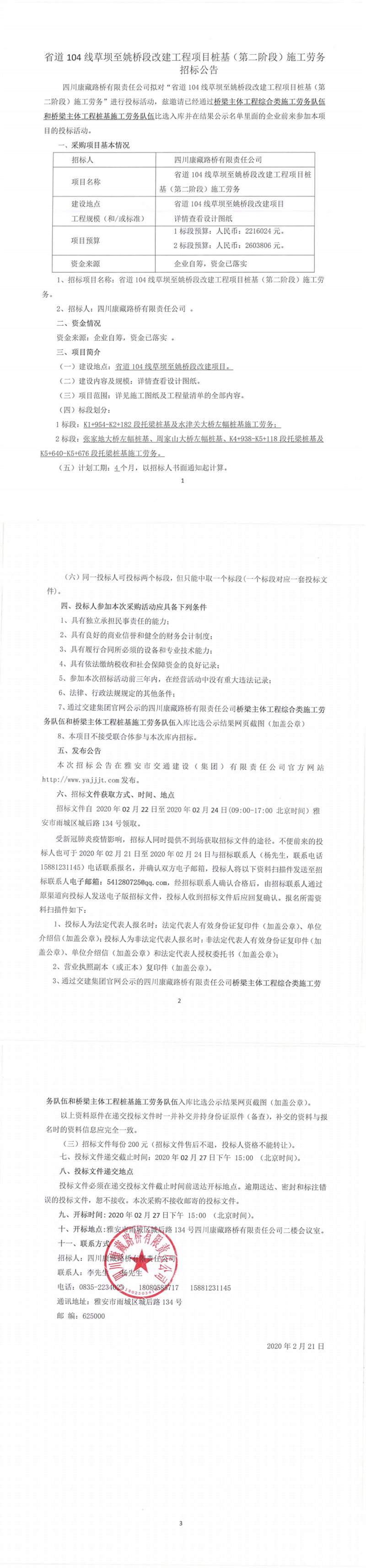 四川康藏路橋有限責任公司省道104線草壩至姚橋段改建工程項目樁基(第二階段)施工勞務招標公告