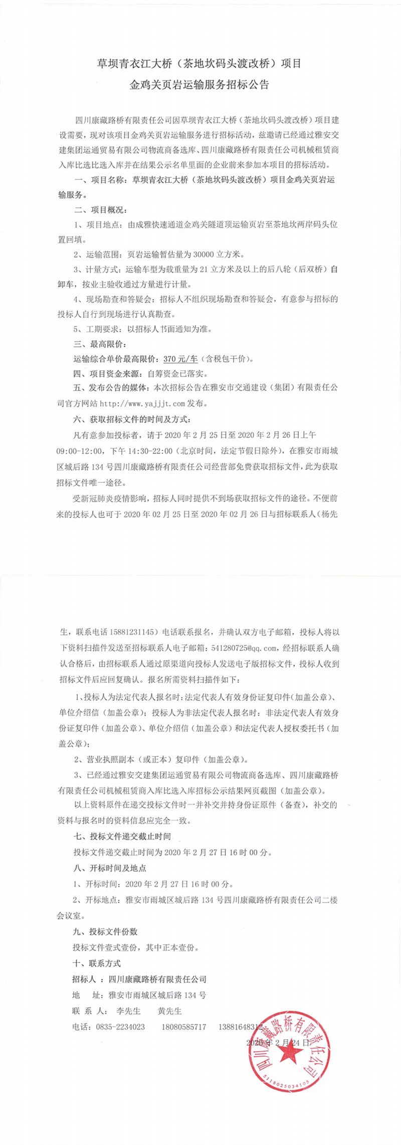 四川康藏路橋有限責(zé)任公司草壩青衣江大橋(茶地坎碼頭渡改橋)項目金雞關(guān)頁巖運輸服務(wù)招標(biāo)公告