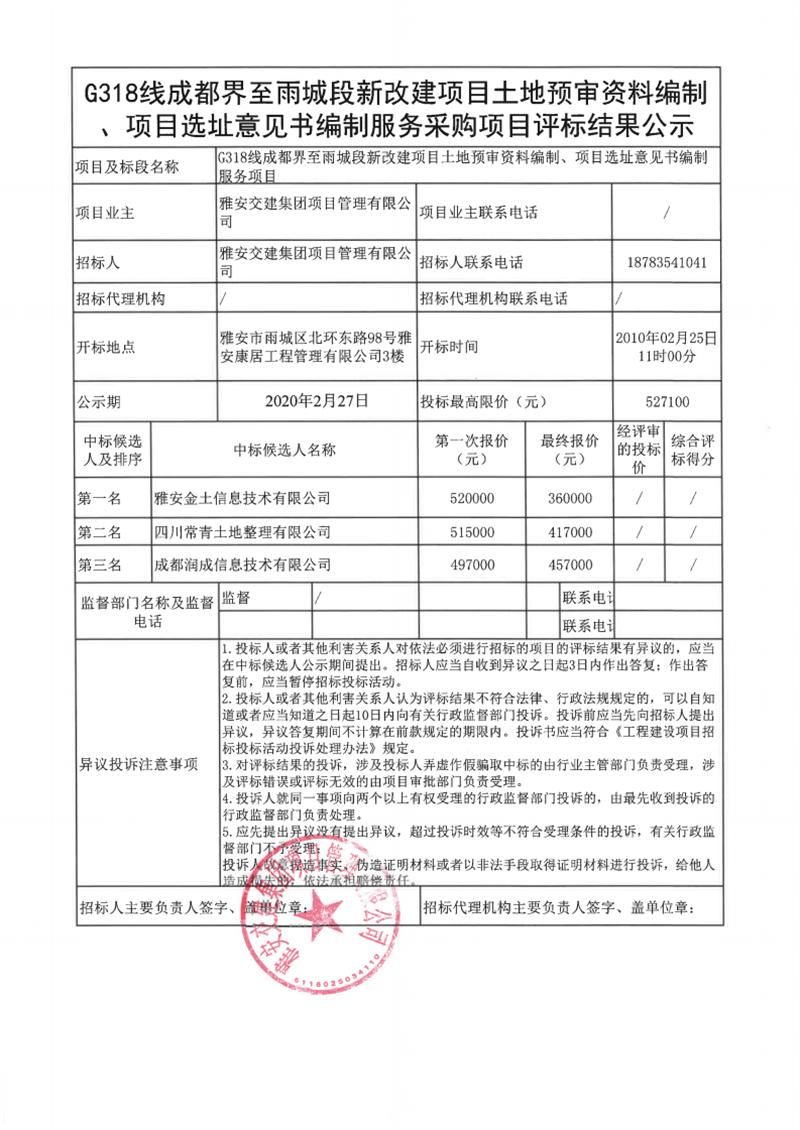 雅安交建集團(tuán)項(xiàng)目管理有限公司G318線成都界至雨城段新改建項(xiàng)目土地預(yù)審資料編制、項(xiàng)目選址意見書編制服務(wù)采購(gòu)項(xiàng)目評(píng)標(biāo)結(jié)果公示