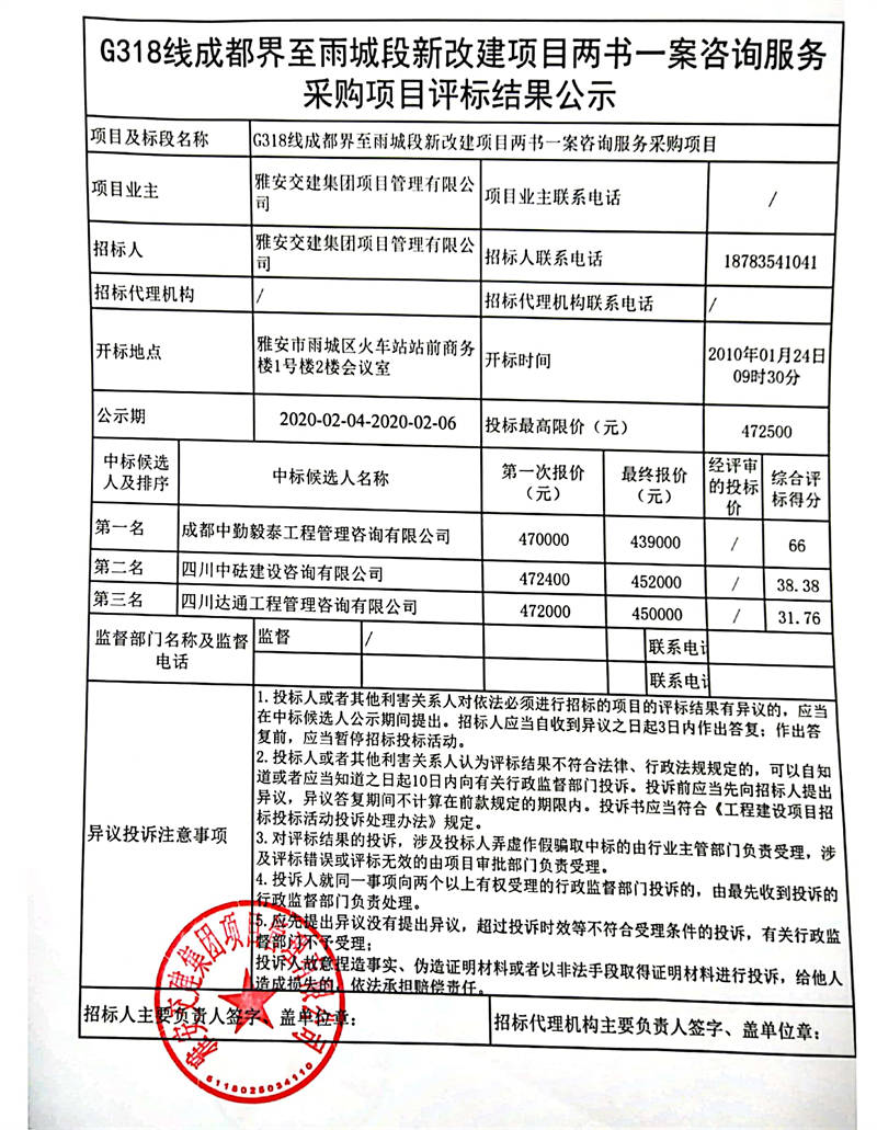 雅安交建集團項目管理有限公司G318線成都界至雨城段新改建項目兩書一案咨詢服務采購項目評標結果公示