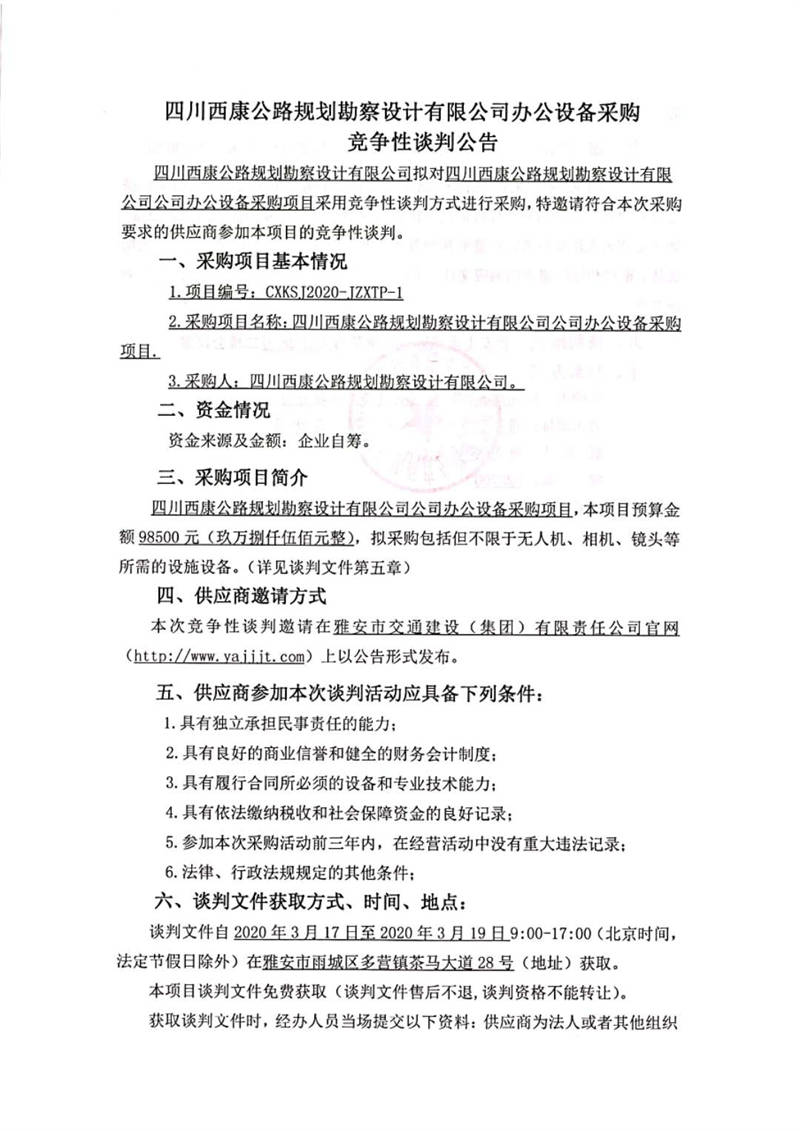 四川西康公路規(guī)劃勘察設(shè)計(jì)有限公司辦公設(shè)備采購(gòu)競(jìng)爭(zhēng)性談判公告