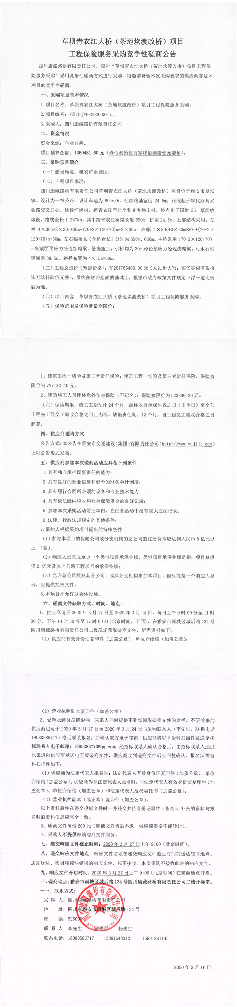 四川康藏路橋有限責(zé)任公司草壩青衣江大橋(茶地坎渡改橋)項目工程保險服務(wù)采購競爭性磋商公告