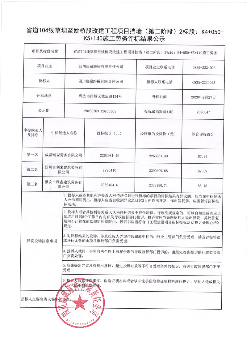 四川康藏路橋有限責(zé)任公司省道104線草壩至姚橋段改建工程項(xiàng)目擋墻(第二階段)2標(biāo)段:K4+050-K5+140施工勞務(wù)評(píng)標(biāo)結(jié)果公示