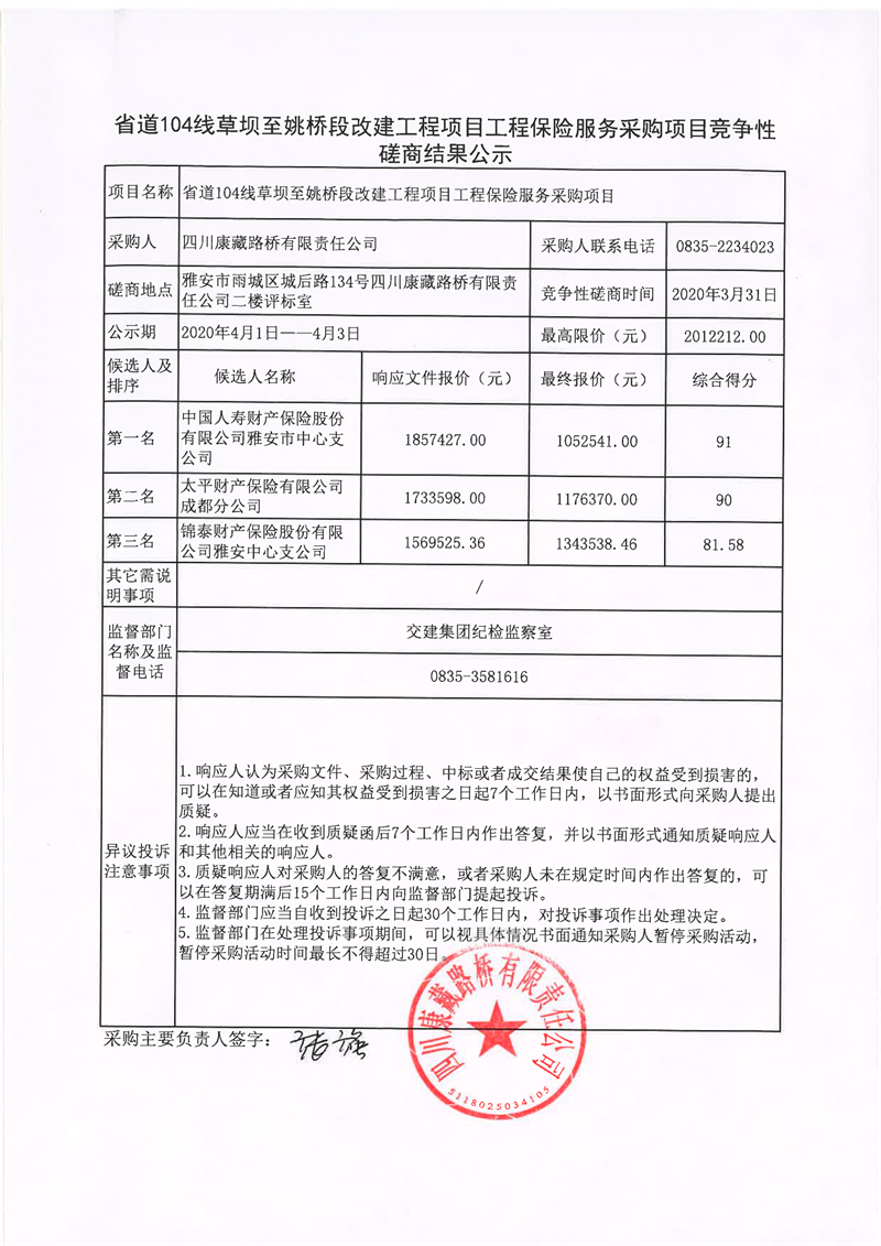 四川康藏路橋有限責(zé)任公司省道104線草壩至姚橋段改建工程項(xiàng)目工程保險(xiǎn)服務(wù)采購(gòu)項(xiàng)目競(jìng)爭(zhēng)性磋商結(jié)果公示