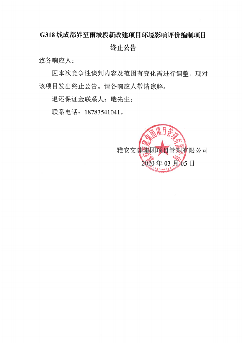 雅安交建集團(tuán)項目管理有限公司G318線成都界至雨城段新改建項目環(huán)境影響評價編制項目終止公告