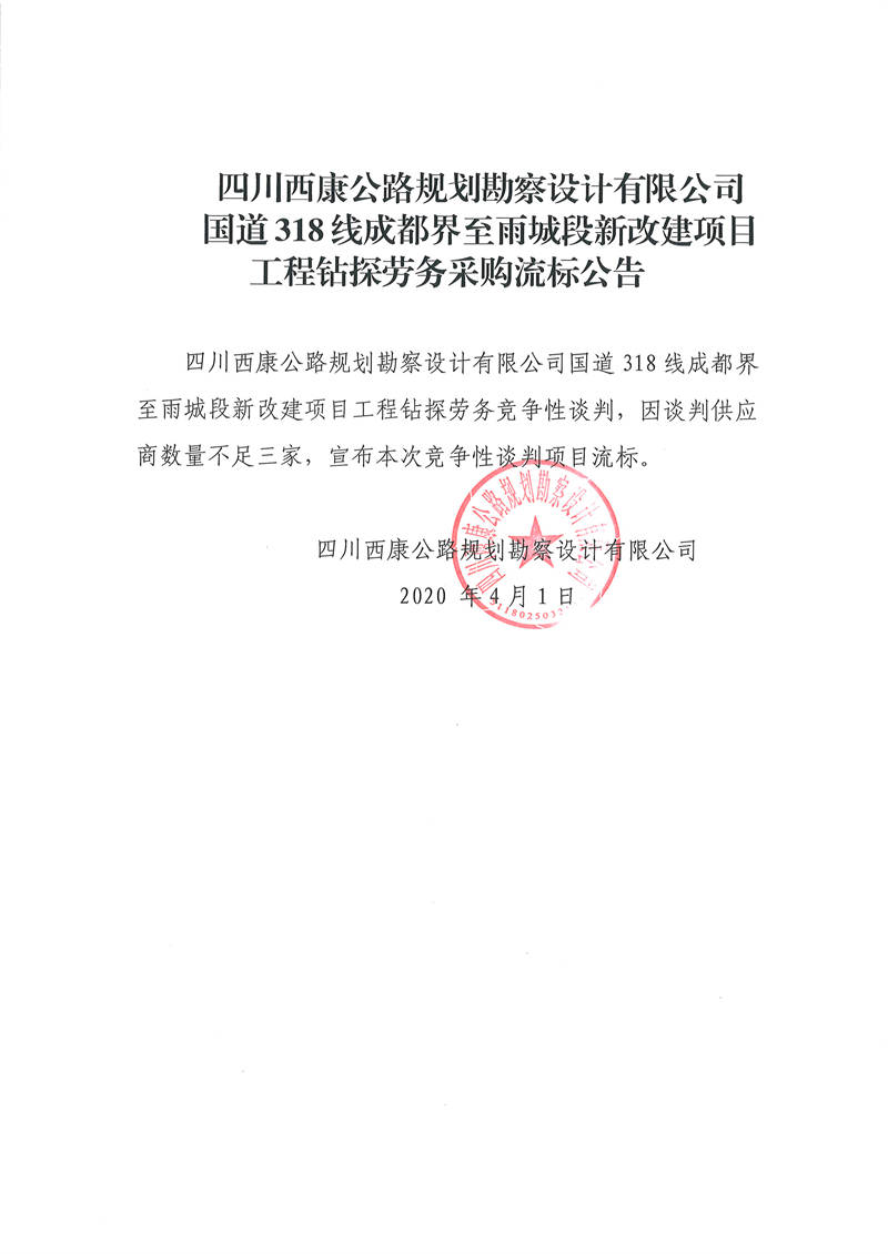 四川西康公路規(guī)劃勘察設(shè)計有限公司國道318線成都界至雨城段新改建項目工程鉆探勞務(wù)采購流標(biāo)公告