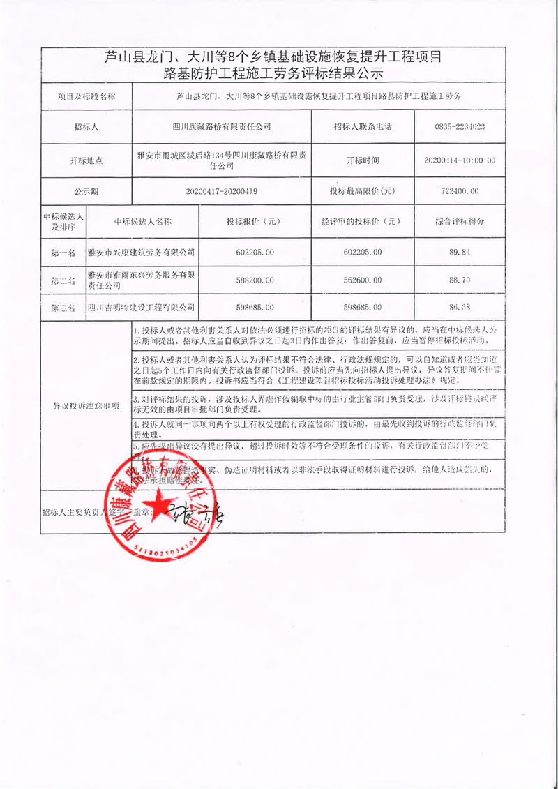 四川康藏路橋有限責(zé)任公司蘆山縣龍門、大川等8個(gè)鄉(xiāng)鎮(zhèn)基礎(chǔ)設(shè)施恢復(fù)提升工程項(xiàng)目路基防護(hù)工程施工勞務(wù)評標(biāo)結(jié)果公示