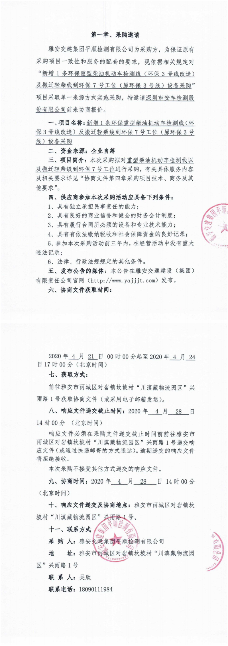雅安交建集團平順檢測有限公司新增1條環(huán)保重型柴油機動車檢測線(環(huán)保3號線改造)及搬遷輕柴線到環(huán)保7號工位(原環(huán)保3號線)設(shè)備采購單一來源協(xié)商公告