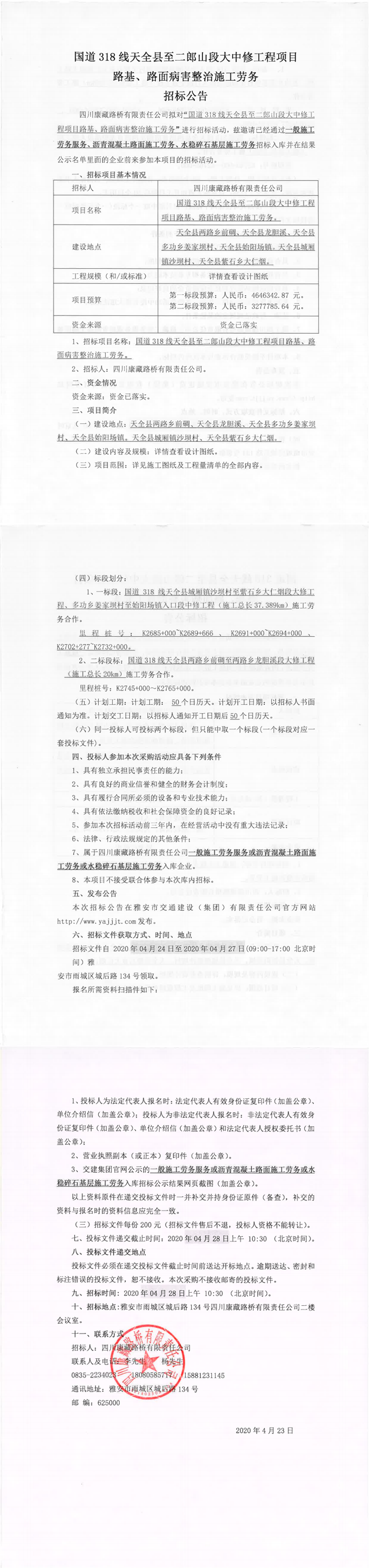 四川康藏路橋有限責任公司國道318線天全縣至二郎山段大中修工程項目路基、路面病害整治施工勞務(wù)招標公告