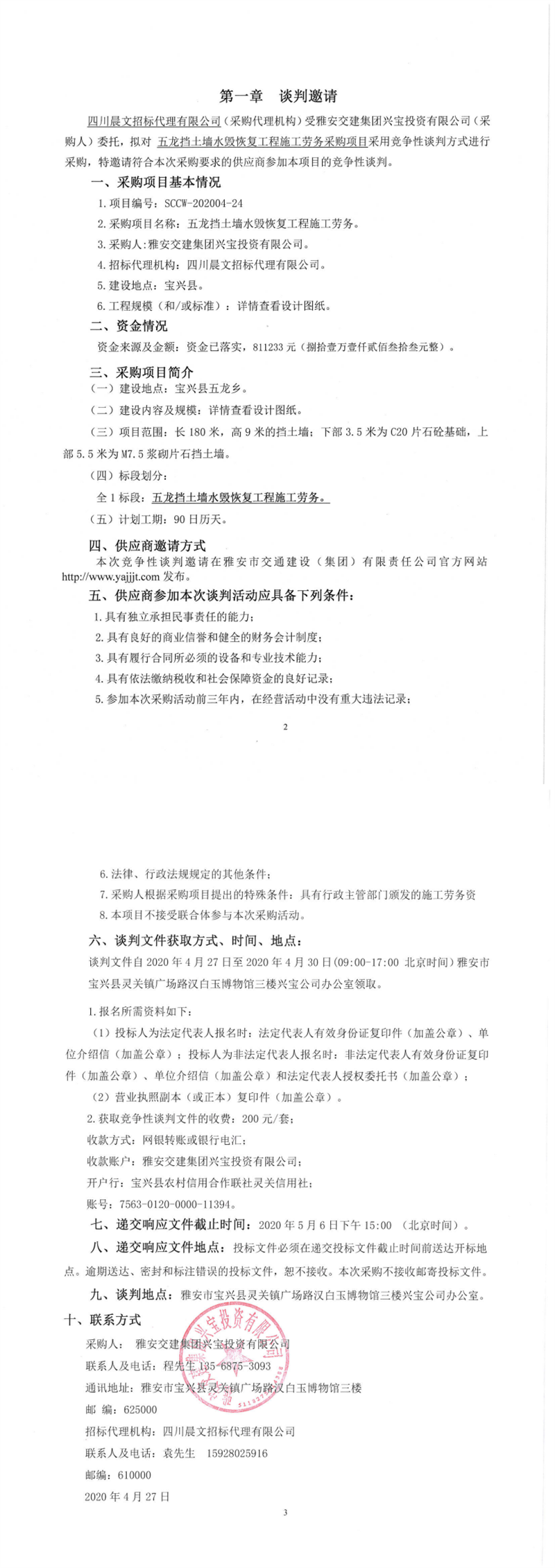 雅安交建集團興寶投資有限公司五龍擋土墻水毀恢復工程施工勞務采購項目競爭性談判公告