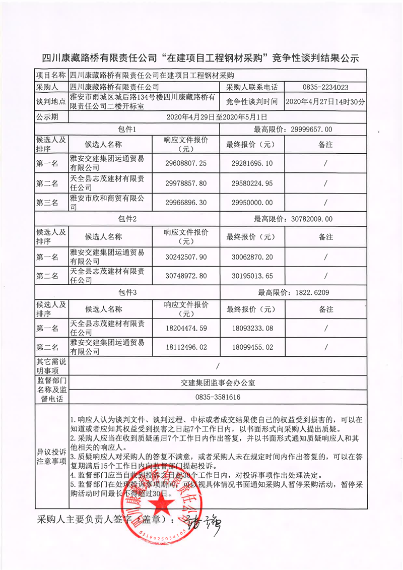四川康藏路橋有限責任公司“在建項目工程鋼材采購”競爭性談判結(jié)果公示