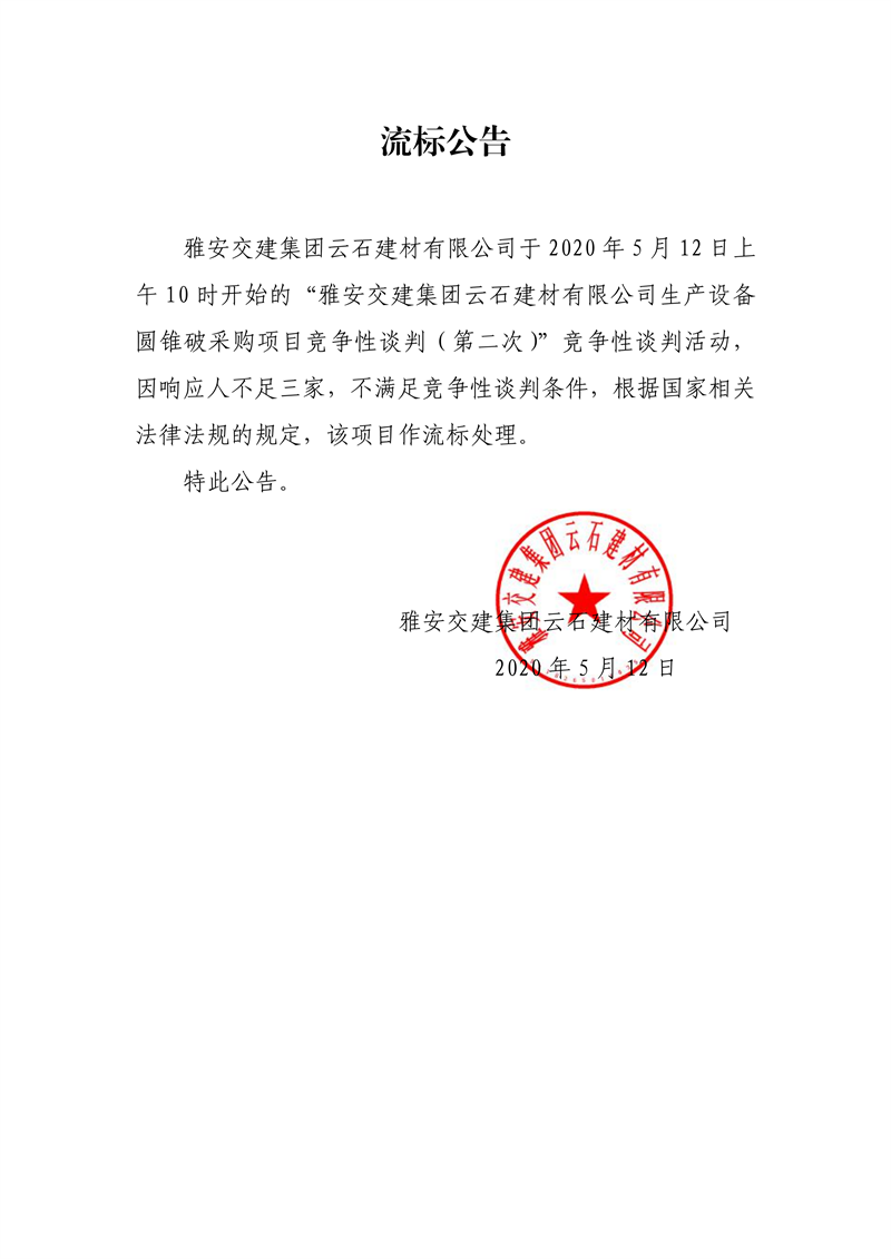 雅安交建集團云石建材有限公司生產(chǎn)設(shè)備圓錐破采購項目(第二次)流標公告