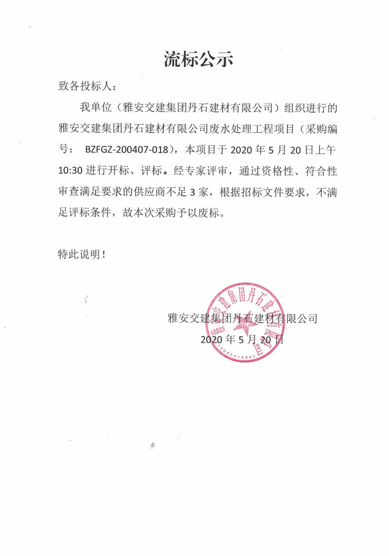 雅安交建集團丹石建材有限公司廢水處理工程項目流標公示